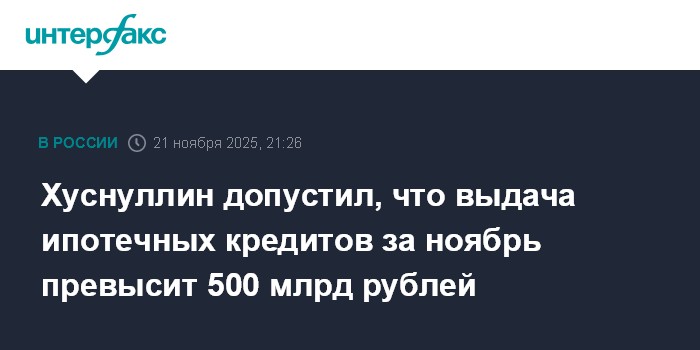 Москва. 21 ноября. INTERFAX.RU - Вице-премьер РФ Марат Хуснуллин прогнозирует, что объем выдачи ипотечных кредитов в России за ноябрь превысит отметку в 500 млрд рублей, при этом называет ситуацию по ипотеке тревожной.