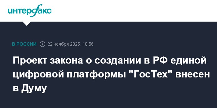 Москва. 22 ноября. INTERFAX.RU - Правительство РФ внесло в Госдуму проект закона "О единой цифровой платформе Российской Федерации "ГосТех".