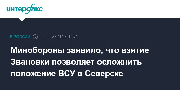 Москва. 22 ноября. INTERFAX.RU - Взятие под контроль села Звановка в ДНР позволяет российским военнослужащим осложнить положение гарнизона вооруженных сил Украины (ВСУ) в Северске, заявили в Минобороны России в субботу.