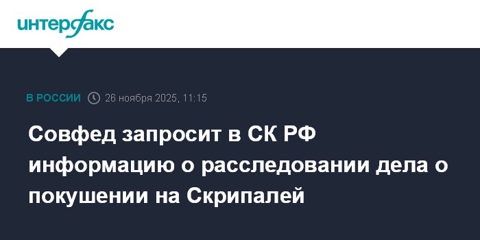 Москва. 26 ноября. INTERFAX.RU - Совет Федерации намерен запросить в Следственном комитете перспективы расследования возбужденного несколько лет назад уголовного дела по признакам покушении на Сергея Скрипаля и его дочери Юлии на территории Великобритании.