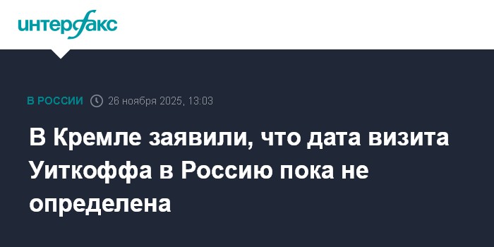 Москва. 26 ноября. INTERFAX.RU - Точной даты визита спецпосланника президента США Стива Уиткоффа в Россию пока нет, заявил пресс-секретарь главы российского государства Дмитрий Песков.