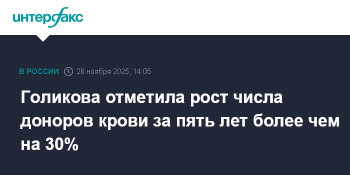 Москва. 26 ноября. INTERFAX.RU - В России количество доноров крови за последние пять лет увеличилось более чем на 30%; с начала 2025 года совершено более 2 млн донаций, сообщила на Всероссийском Форуме Службы крови вице-премьер Татьяна Голикова.