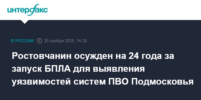 Москва. 26 ноября. INTERFAX.RU - Военный суд в Москве приговорил к 24 годам колонии уроженца Ростова-на-Дону, который по заданию украинских спецслужб запускал БПЛА в Подмосковье с целью выявления уязвимостей в работе ПВО, сообщил Центр общественных связей (ЦОС) ФСБ РФ.