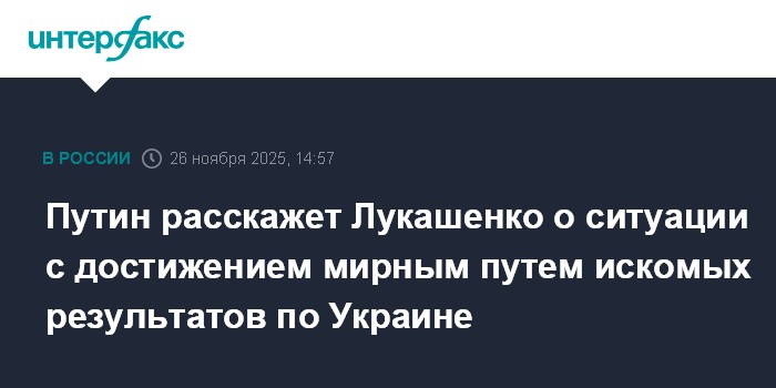Москва. 26 ноября. INTERFAX.RU - Президент РФ Владимир Путин пообещал в ходе двусторонней встречи проинформировать своего белорусского коллегу Александра Лукашенко о ситуации с достижением нужных Москве результатов на украинском направлении мирными средствами.