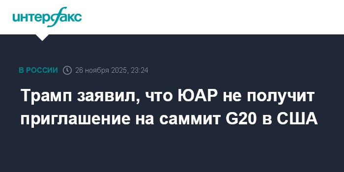 Москва. 26 ноября. INTERFAX.RU - Президент США Дональд Трамп в среду заявил, что ЮАР не приглашена на следующий саммит G20, который должен пройти в американском штате Флорида в декабре 2026 года.