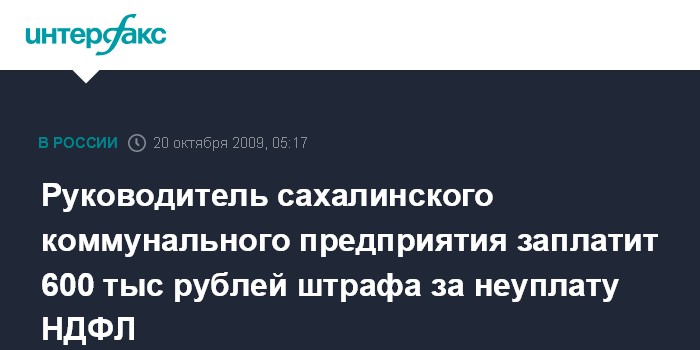 Руководитель сахалинского коммунального предприятия заплатит 600 тыс рублей штрафа за неуплату НДФЛ