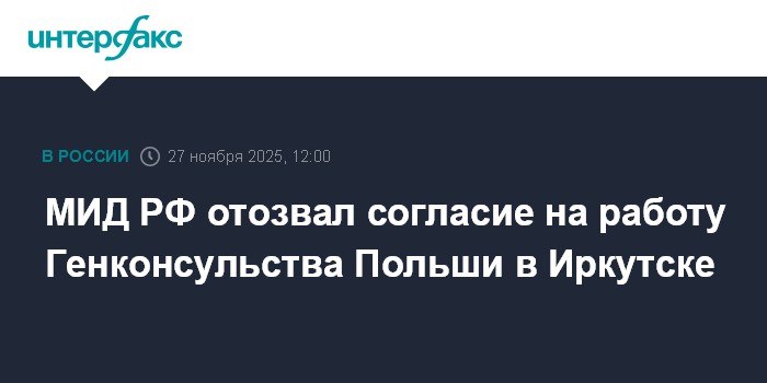 "27 ноября в МИД России был вызван посол Польши в Российской Федерации, которому вручена нота, уведомляющая, что в качестве ответной меры на отзыв польскими властями с 23 декабря 2025 года согласия на функционирование Генерального консульства России в Гданьске российская сторона приняла решение об отзыве с 30 декабря 2025 года согласия на функционирование Генерального консульства Польши в Иркутске", - говорится в сообщении, опубликованном на сайте российского внешнеполитического ведомства.