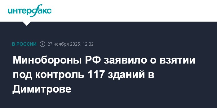 Москва. 27 ноября. INTERFAX.RU - Российская армия взяла под контроль 117 зданий в Димитрове (Мирнограде), сообщило Минобороны РФ в четверг.