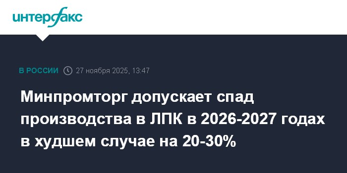 "В 2025 году мы наблюдаем существенное снижение уровня производства продукции. При этом, ввиду усложнения геополитической ситуации, по нашей оценке, в 2026-2027 году эта ситуация может продолжиться. Тренд на ухудшение. Соответственно, вот негативные факторы, которые влияют (...) - это дальнейшее сохранение ключевой ставки, усиление санкционного давления, дальнейшее укрепление или текущее состояние крепкого рубля к доллару, и закрытие оставшихся тех экспортных рынков, которые у нас есть из-за вторичных или третичных санкций. При самом худшем сценарии мы предполагаем, что будет на уровне 20-30% снижение объемов производства и стараемся помогать предприятиям, чтобы этого не произошло", - заявил замминистра промышленности и торговли Михаил Юрин на заседании совета по вопросам развития лесного комплекса при Совете Федерации.