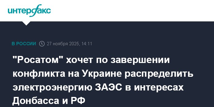 Москва. 27 ноября. INTERFAX.RU - После достижения договоренностей по урегулированию украинского конфликта "Росатом" начнет "поднимать" Запорожскую АЭС и распределит электроэнергию станции в интересах Донбасса и России, заявил глава госкорпорации Алексей Лихачев.