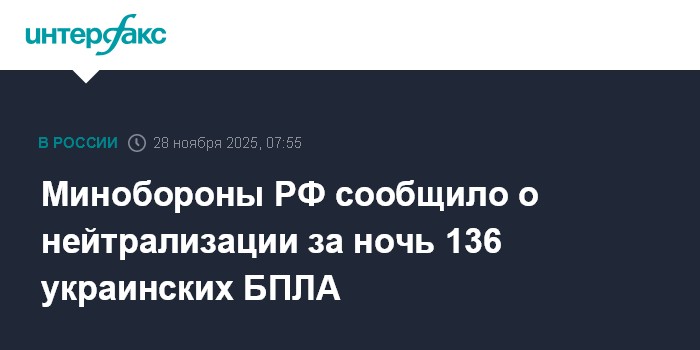Москва. 28 ноября. INTERFAX.RU - Министерство обороны РФ заявило, что в течение прошедшей ночи были перехвачены и уничтожены 136 украинских беспилотных летательных аппаратов.
