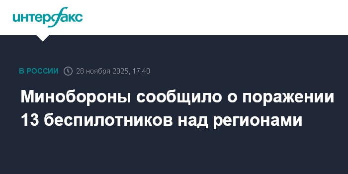 Москва. 28 ноября. INTERFAX.RU - Средства ПВО с 13:00 до 17:00 по Москве нейтрализовали 13 дронов самолетного типа над российскими регионами, сообщили в Минобороны.
