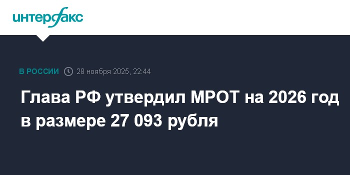 Москва. 28 ноября. INTERFAX.RU - Президент РФ Владимир Путин подписал закон об установлении минимального размера оплаты труда (МРОТ) с 1 января 2026 года в размере 27 тыс. 093 рублей в месяц.