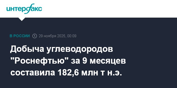 Москва. 29 ноября. INTERFAX.RU - Добыча жидких углеводородов "Роснефтью" за 9 месяцев 2025 года составила 134,7 млн т (3,67 млн барр./сут), в том числе в третьем квартале - 45,4 млн т, сообщила компания.