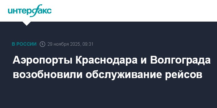 Москва. 29 ноября. INTERFAX.RU - Аэропорты Краснодара и Волгограда снова принимают и отправляют рейсы, сообщил представитель Росавиации Артем Кореняко.