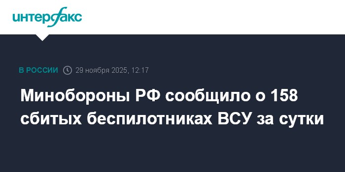 Москва. 29 ноября. INTERFAX.RU - Российские военные уничтожили в течение суток 158 украинских дронов самолетного типа, сообщило Минобороны РФ в субботу.
