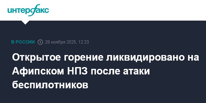Москва. 29 ноября. INTERFAX.RU - Ликвидировано открытое горение на территории Афипского нефтеперерабатывающего завода, где произошел пожар после атаки беспилотников, сообщил в субботу оперативный штаб Краснодарского края в своем телеграм-канале.