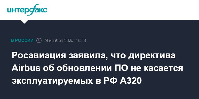 "Предварительный анализ выпущенной директивы показал, что она не касается самолетов семейства Airbus A320, эксплуатирующихся российскими авиакомпаниями", - говорится в сообщении Росавиации, опубликованном в ее телеграм-канале.