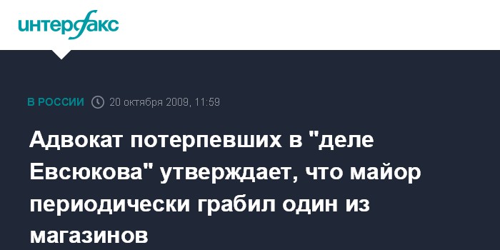 "Мы имеем показания одного из руководителей магазина "Остров". Он сказал, что Евсюков ранее совершал грабежи этого магазина. Набирал полную тележку продуктов и не оплачивал их. При этом он демонстрировал удостоверение сотрудника милиции, грубил и ругался. Запугивал тем, что он личность неприкосновенная: сопротивление ему, как представителю власти, карается законом", - заявил во вторник "Интерфаксу" Игорь Трунов, представляющий интересы потерпевших в "деле Евсюкова".