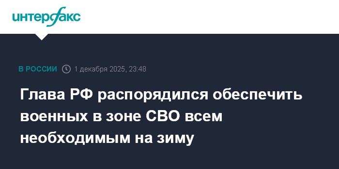 Москва. 1 декабря. INTERFAX.RU - Президент РФ Владимир Путин поручил обеспечить российских военных в зоне СВО всем необходимым с учетом начинающейся зимы.
