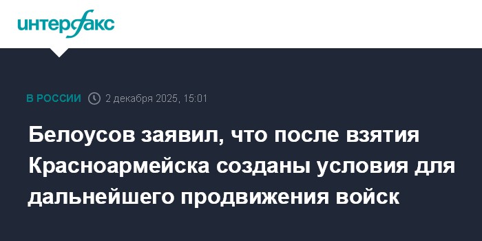 Белоусов заявил, что после взятия Красноармейска созданы условия для дальнейшего продвижения войск