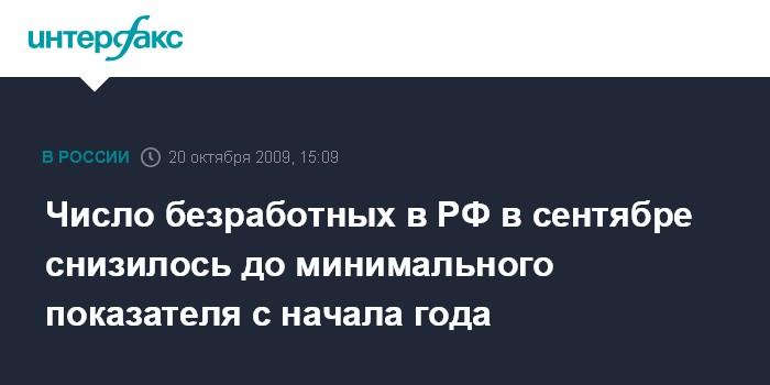 Число безработных в конце сентября стало минимальным с начала года (на начало года число безработных равнялось 5,895 млн человек), но превышало показатель сентября 2008 года на 1 млн человек (в сентябре 2008 года - 4,744 млн человек).
