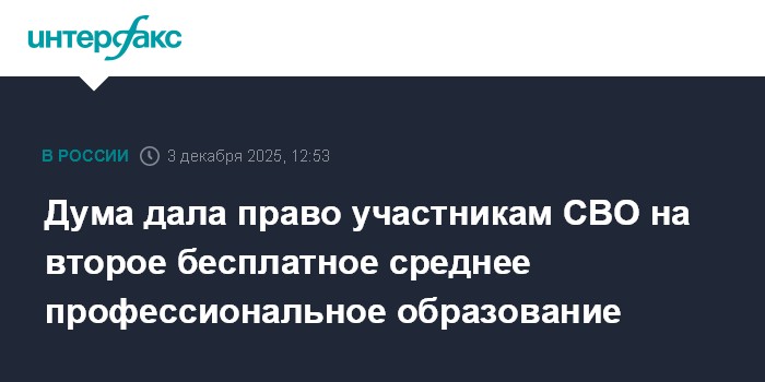 Москва. 3 декабря. INTERFAX.RU - Госдума в среду приняла во втором и в третьем чтении закон о возможности повторного получения участниками СВО среднего профессионального образования по другой профессии или специальности на безвозмездной основе.