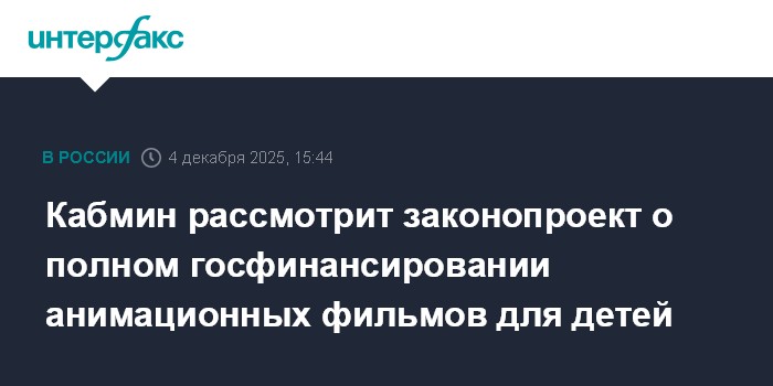 Москва. 4 декабря. INTERFAX.RU - Правительство РФ в четверг рассмотрит законопроект, устанавливающий полное государственное финансирование анимационных картин для детей и юношества, сообщил премьер-министр Михаил Мишустин.