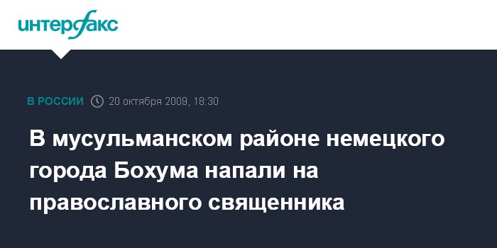 Москва. 20 октября. INTERFAX.RU - Нападение на православного священника Алексия Рыбакова совершено в немецком городе Бохуме.