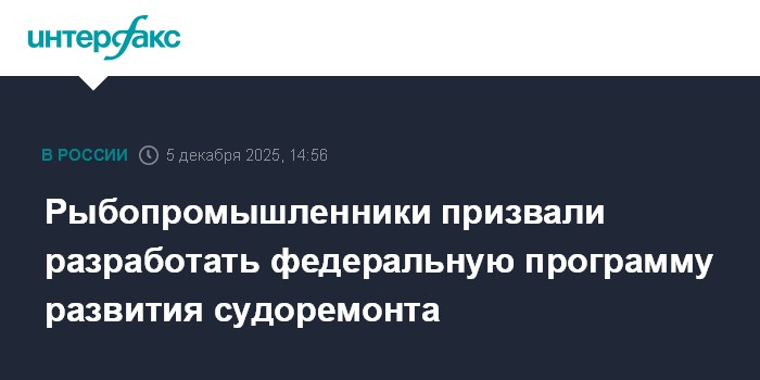 Москва. 5 декабря. INTERFAX.RU - России для дальнейшего развития рыбопромыслового флота нужна федеральная программа развития отечественных судоремонтных мощностей, заявил "Интерфаксу" президент Всероссийской ассоциации рыбопромышленников (ВАРПЭ) Герман Зверев.