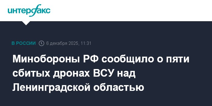 Москва. 6 декабря. INTERFAX.RU - Дежурные средства противовоздушной обороны уничтожили пять украинских беспилотников самолетного типа над Ленинградской областью, сообщили в Минобороны РФ в субботу.