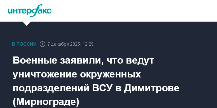 Москва. 7 декабря. INTERFAX.RU - Российские войска ведут уничтожение окруженных в Димитрове (Мирнограде) украинских подразделений, сообщило Минобороны РФ в воскресенье.