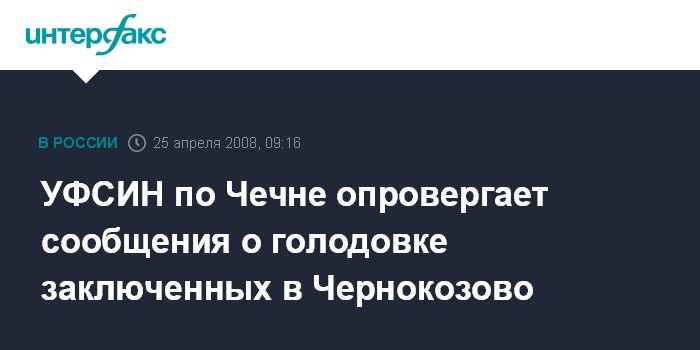 Грозный. 25 апреля. INTERFAX.RU - Сообщения некоторых СМИ о том, что заключенные колонии в Чернокозово (Чечня), объявили голодовку, не соответствуют действительности, заявляют в УФСИН Минюста РФ по республике.