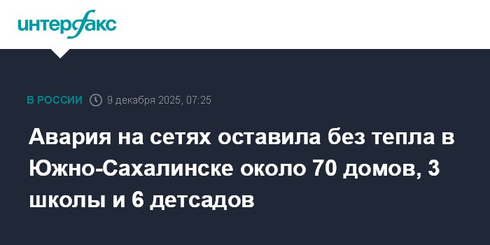 Москва. 9 декабря. INTERFAX.RU - Крупная авария на сетях оставила около 70 многоквартирных домов и несколько соцобъектов без отопления, сообщает пресс-служба мэрии Южно-Сахалинска во вторник.