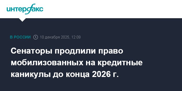 Москва. 10 декабря. INTERFAX.RU - Совет Федерации на заседании в среду одобрил закон, который продлевает до 31 декабря 2026 г. срок, в течение которого мобилизованные лица и участники СВО, а также члены их семей вправе обратиться к кредитору с требованием о предоставлении "кредитных каникул". Период действия нормы истекал 31 декабря 2025 г.
