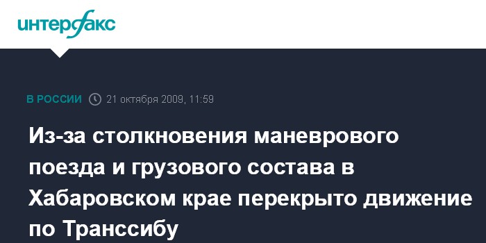 Москва. 21 октября. INTERFAX.RU – В Хабаровском крае, где в среду днем в результате столкновения маневрового поезда и железнодорожного состава опрокинулись семь вагонов с углем, в обоих направлениях перекрыто движение по Транссибу.