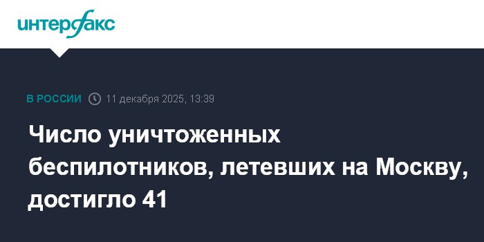 Москва. 11 декабря. INTERFAX.RU - Мэр Москвы Сергей Собянин сообщил о еще двух сбитых БПЛА, летевших на Москву, общее количество уничтоженных беспилотников с полуночи четверга выросло до 41.