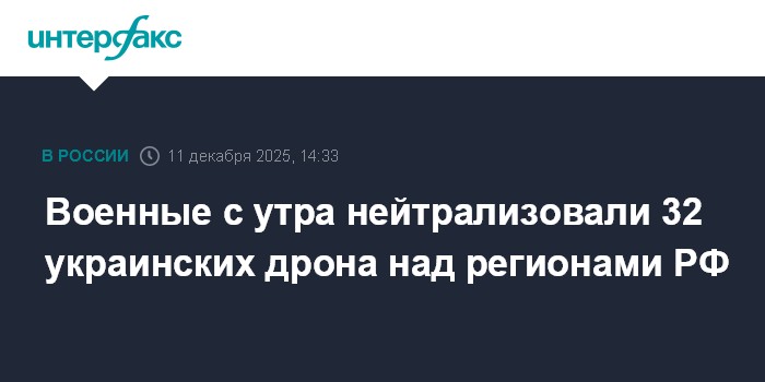 Москва. 11 декабря. INTERFAX.RU - Российскими средствами ПВО c 08:00 до 14:00 четверга нейтрализованы 32 украинских беспилотника, сообщили в Минобороны РФ.