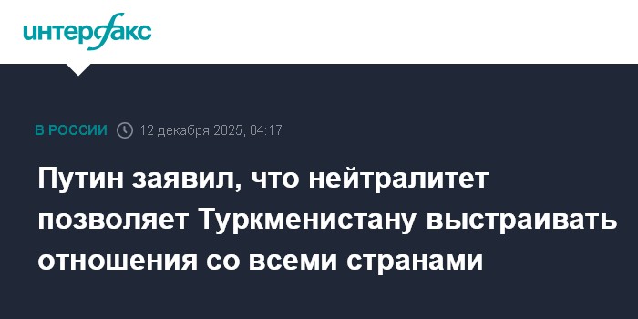 Москва. 12 декабря. INTERFAX.RU - Принятый Туркменистаном путь нейтралитета оправдывает себя, позволяя выстраивать конструктивные отношения со всеми странами, заявил президент РФ Владимир Путин на встрече в Ашхабаде с национальным лидером туркменского народа, председателем Народного совета страны Гурбангулы Бердымухамедовым.