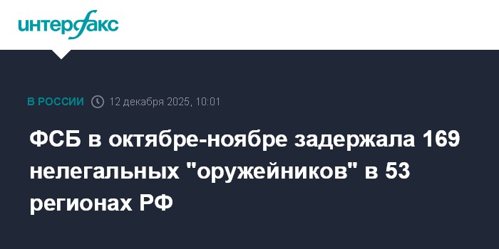 Москва. 12 декабря. INTERFAX.RU - В ФСБ сообщили о задержании в октябре и ноябре 169 человек, причастных к незаконному обороту оружия в 53 субъектах РФ, прекращена работа 44 подпольных мастерских по переделке оружия.