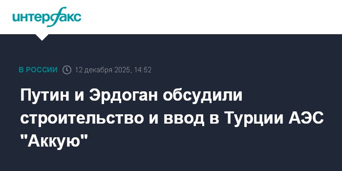 Москва. 12 декабря. INTERFAX.RU - Турция ждет своевременного ввода в эксплуатацию строящейся атомной электростанции "Аккую", сообщил пресс-секретарь президента Дмитрий Песков после встречи в Ашхабаде Владимира Путина и турецкого президента Реджепа Тайипа Эрдогана.
