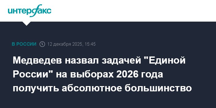 Москва. 12 декабря. INTERFAX.RU - Партия "Единая Россия" ставит задачу получить абсолютное большинство на предстоящих в 2026 году парламентских выборах, заявил председатель партии Дмитрий Медведев.