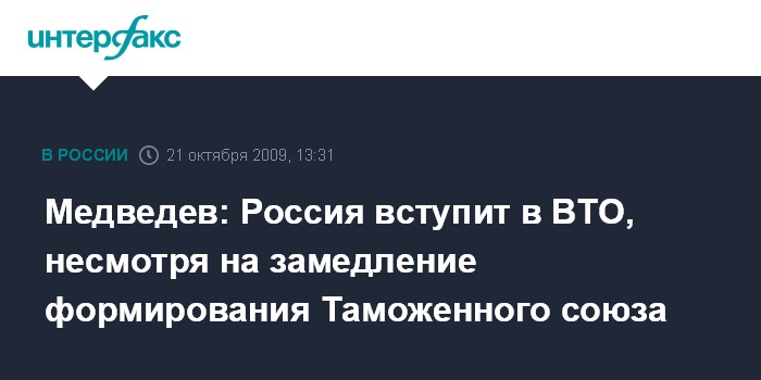 Москва. 21 октября. INTERFAX.RU - Россия вступит во Всемирную торговую организацию, не взирая на некоторое замедление формирования Таможенного союза, заявил президент РФ Дмитрий Медведев. "В ВТО мы вступим, несмотря на некоторое замедление, связанное с формированием Таможенного союза. В этом сомневаться не приходиться", - заявил глава государства на встрече с российскими предпринимателями в среду.