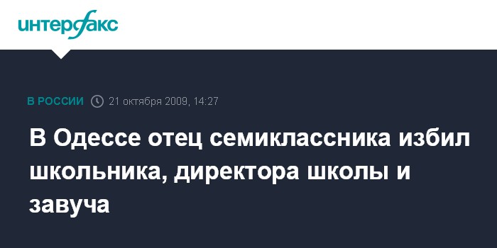 Одесса. 21 октября. INTERFAX.RU - Отец семиклассника школы N125 жестоко избил другого ученика седьмого класса, с которым подрался его сын, а также директора школы и завуча, которые пытались заступиться за ученика.