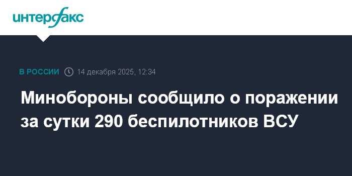 Москва. 14 декабря. INTERFAX.RU - Средствами противовоздушной обороны сбиты в течение суток 290 украинских беспилотных летательных аппаратов самолетного типа, сообщили в Минобороны РФ в воскресенье.