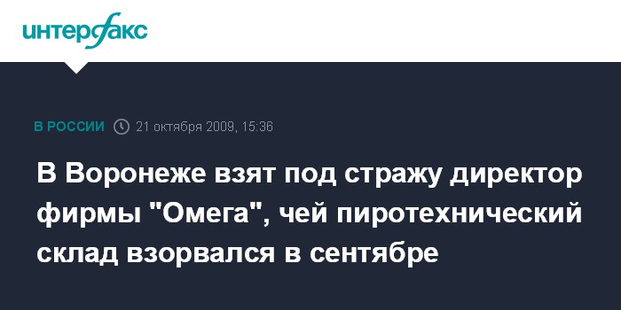Москва. 21 октября. INTERFAX.RU - Директор воронежской фирмы "Омега", которому принадлежал взорвавшийся склад пиротехники, Алексей Рыжов взят под стражу, сообщил "Интерфаксу" в среду старший помощник руководителя регионального СУ СКП РФ Сергей Глазьев. По его словам, Рыжову предъявлено обвинение по ст. 218 УК РФ (нарушение правил учета, хранения и использования пиротехнических изделий, повлекшее по неосторожности смерть человека).