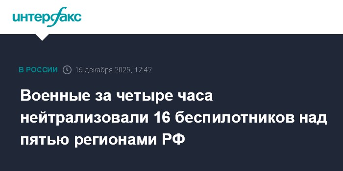 Москва. 15 декабря. INTERFAX.RU - Российские средства ПВО с 8:00 до 12:00 по московскому времени понедельника перехватили и уничтожили 16 украинских беспилотников самолётного типа, сообщает министерство обороны РФ.