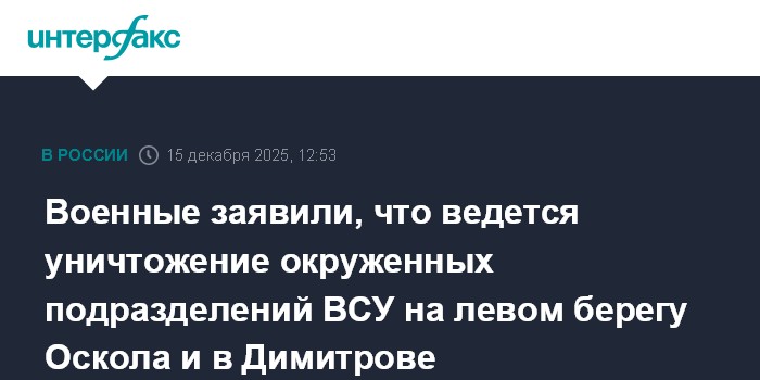 Москва. 15 декабря. INTERFAX.RU - Российские военные ведут уничтожение окруженных украинских подразделений на левом берегу реки Оскол и в Димитрове (Мирнограде), зачищают Светлое, Гришино и Родинское, сообщили в Минобороны РФ в понедельник.
