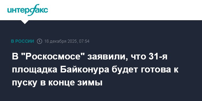 Москва. 16 декабря. INTERFAX.RU - Заместитель генерального директора "Роскосмоса" по ракетным проектам Дмитрий Баранов заявил, что 31-я площадка космодрома Байконур после ремонта кабины обслуживания будет готова к пуску в конце зимы.