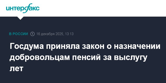 Москва. 16 декабря. INTERFAX.RU - Госдума на заседании во вторник приняла во втором и третьем чтениях закон о назначении гражданам, пребывающим в добровольческих формированиях, пенсий за выслугу лет.